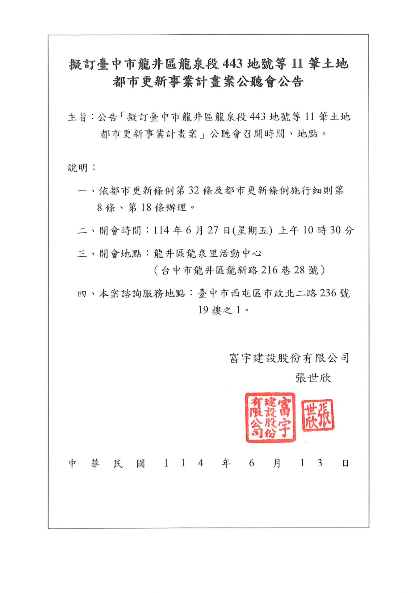 臺中市龍井區龍泉段443地號等11筆土地都市更新案