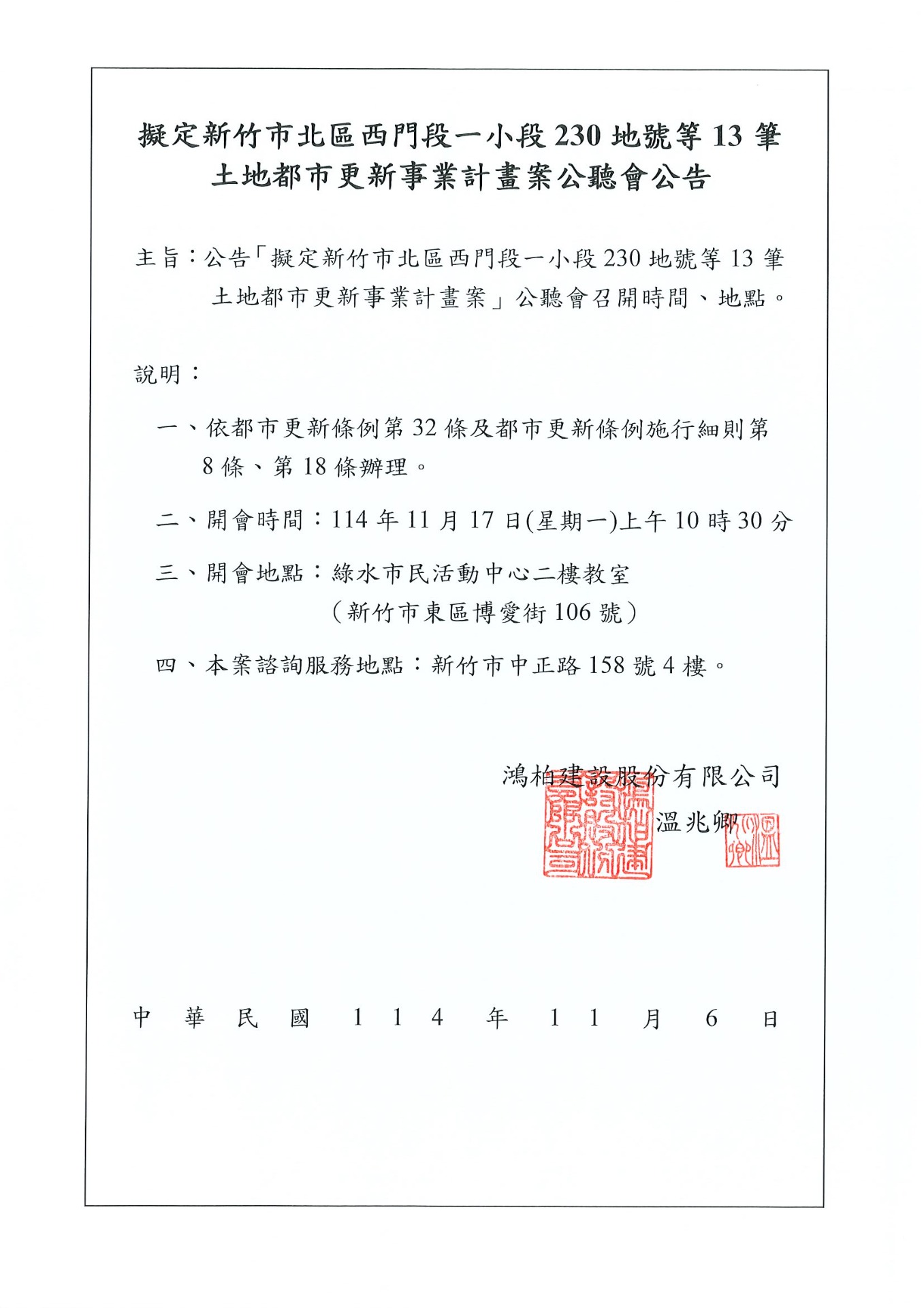 新竹市北區西門段一小段230地號等13筆土地都市更新案